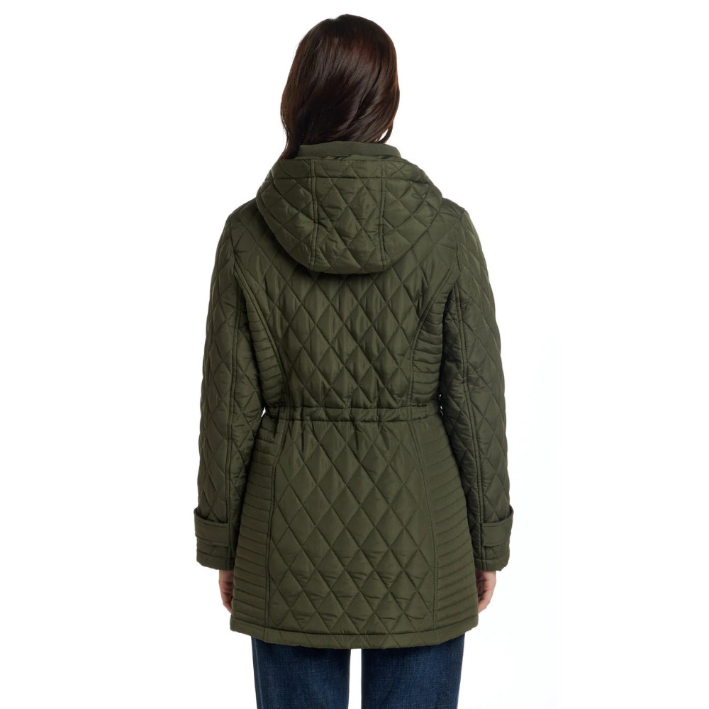 Elle est dotée de poches à boutons-pression, d'une capuche amovible pour un style polyvalent et d'une taille ajustable pour une silhouette féminine et cintrée.